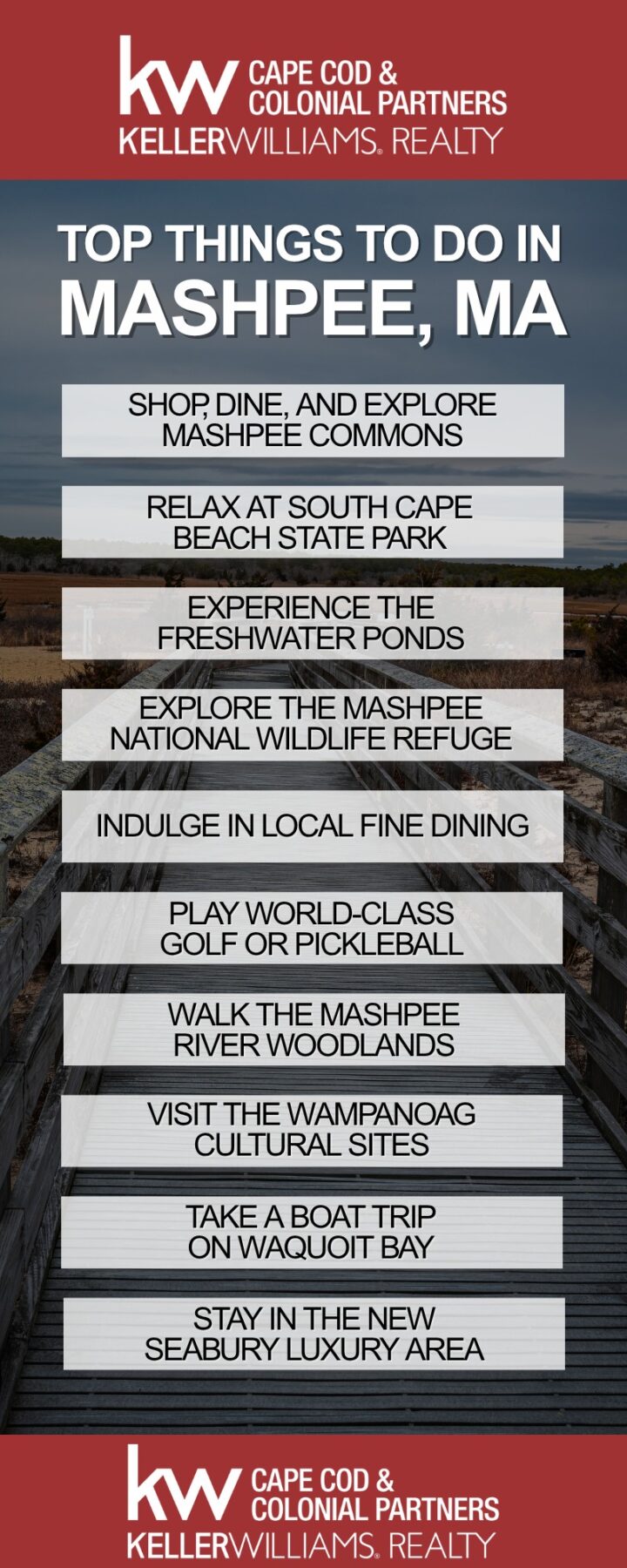 Whether you’re here for a weekend getaway or scouting for your next home, Mashpee offers a perfect balance of charm and sophistication—with countless things to do in Mashpee, MA that highlight its coastal beauty, vibrant community, and relaxed Cape Cod lifestyle.
